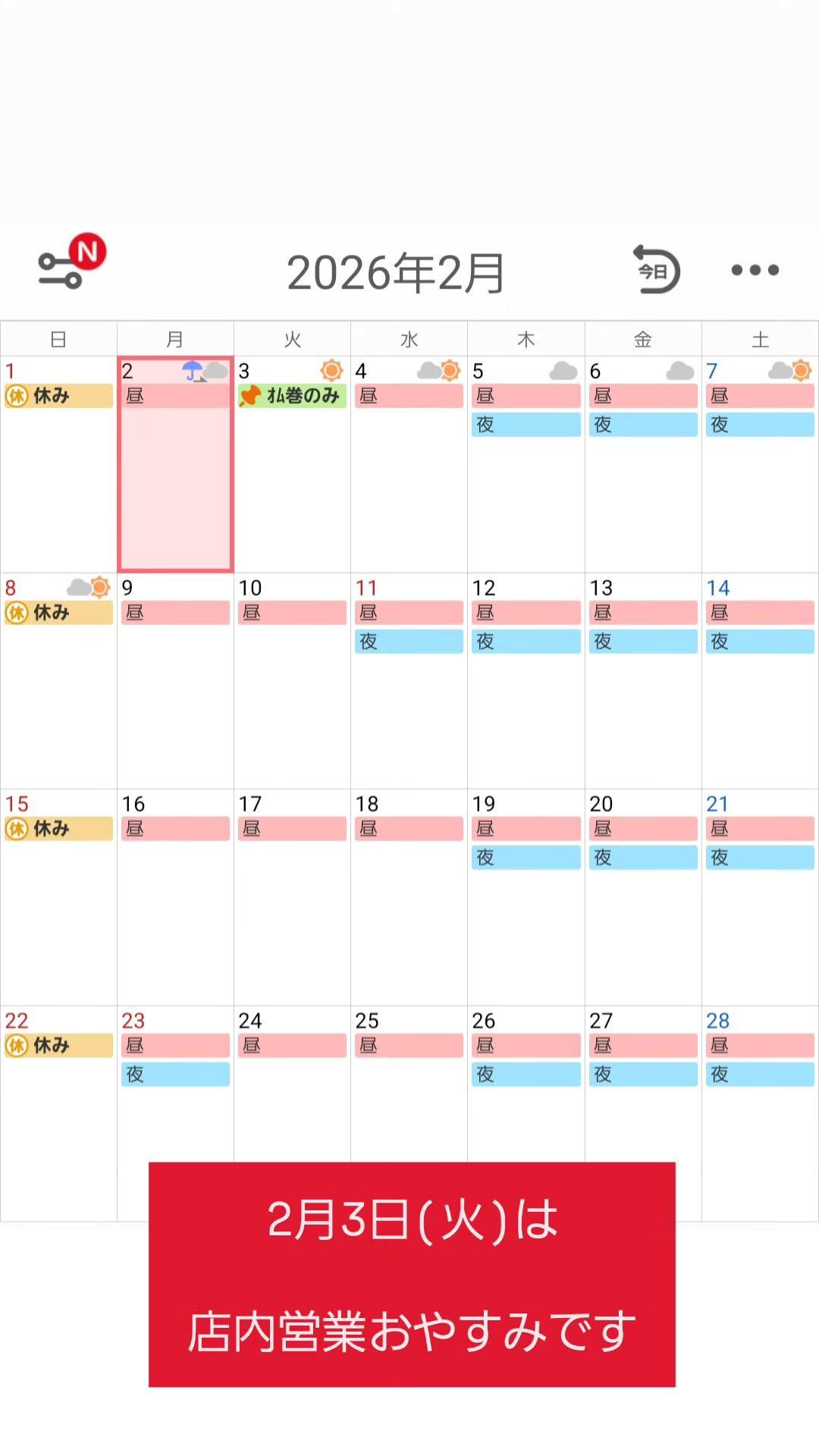 | 月 | 火 | 水 | 木 | 金 | 土 | 日 | 祝 | |